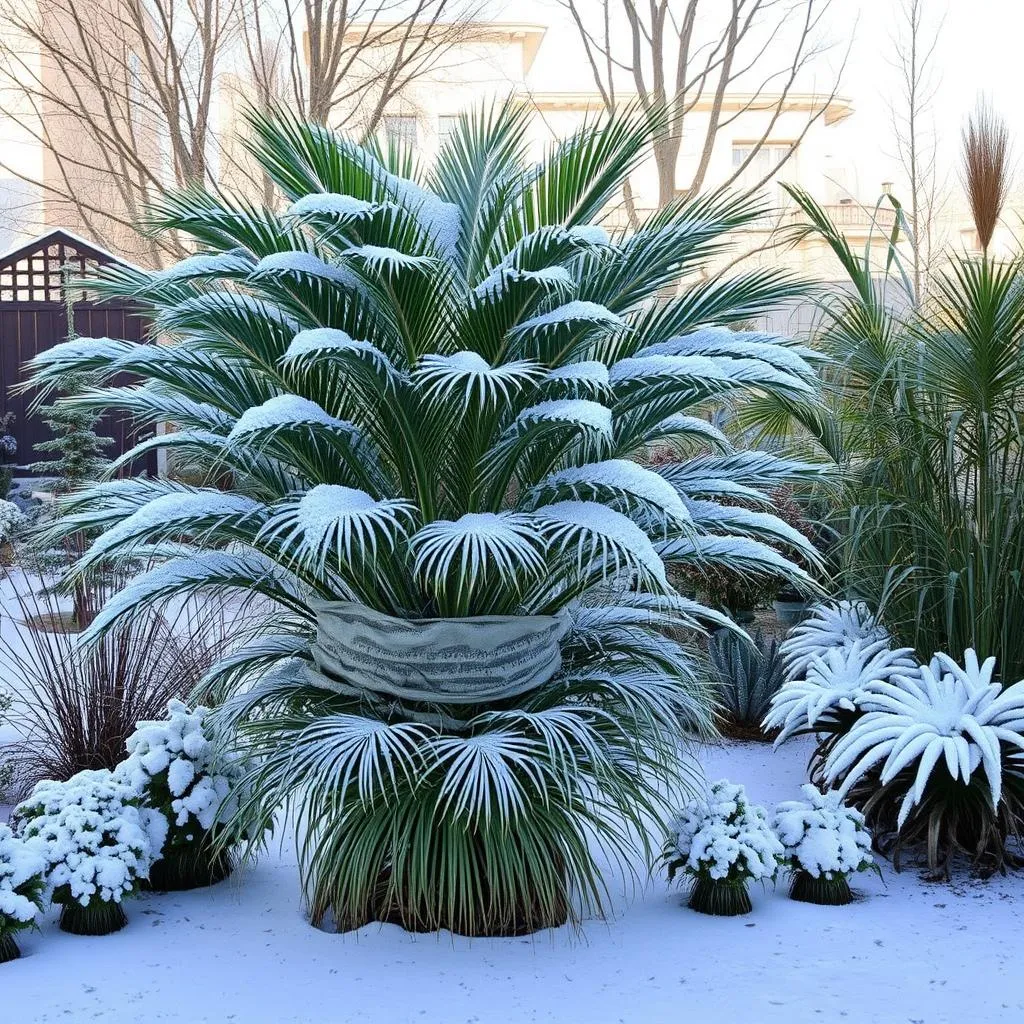 - Kronenschutz: Die Blätter locker mit Vlies zusammenbinden (nicht quetschen!) und mit einer atmungsaktiven Vlieshaube überziehen. Die wachsende Spitze (das Palmherz) ist am empfindlichsten – hier kann ein Bündel trockenes Stroh platziert werden.