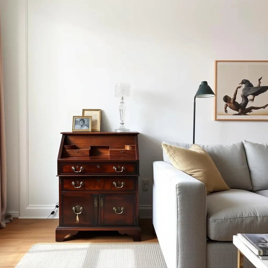 Bestimmte Stücke sind zeitlose Universalgenies: Ein Sekretär oder Schreibkommode (18./19. Jahrhundert) passt als skulpturales Einzelstück in jedes Wohnzimmer. Kristallleuchter über modernen Esstischen erzeugen glamourösen Kontrast. Antike Spiegel mit aufwendigem Rahmen werten jede Wand auf. Perserteppiche bringen Farbe und Muster – ihre unregelmäßige Handknüpfung harmoniert erstaunlich gut mit geradlinigen modernen Möbeln.