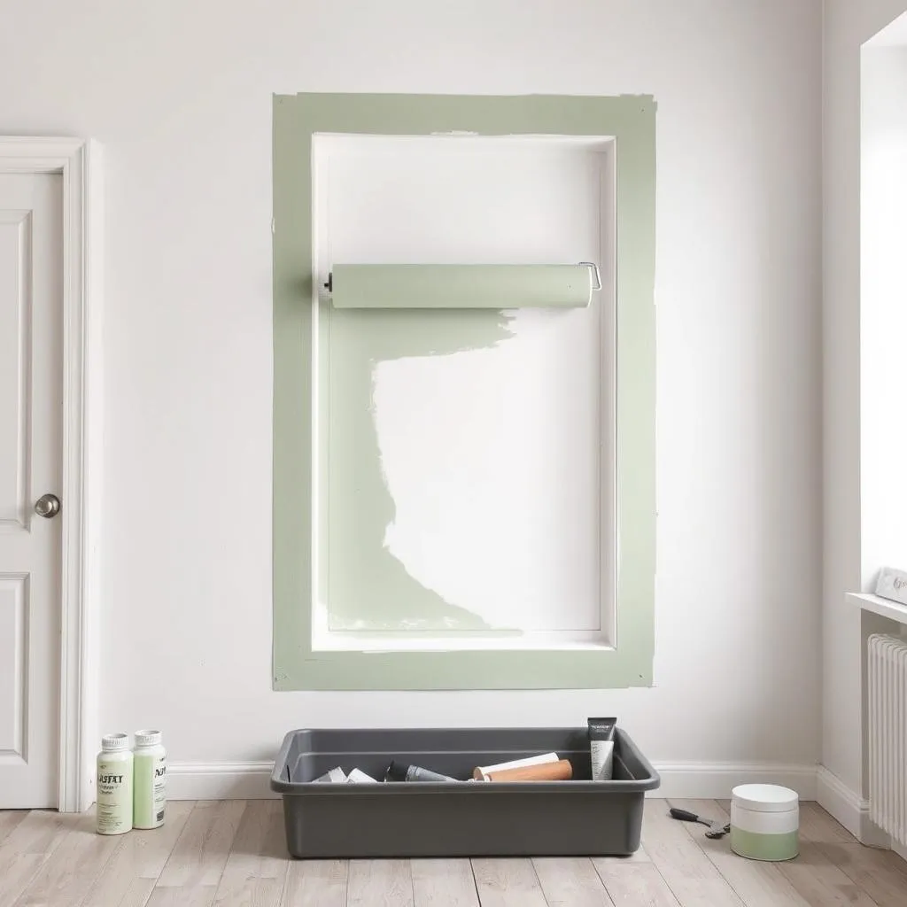 Werkzeug (einmalige Investition, ca. 40 Euro): Farbroller (25 cm Breite, Florlänge 12 mm für glatte Wände, 18 mm für Raufaser). Rollerbügel mit Teleskopstange (spart die Leiter bei Deckenhöhe). Ecken-Pinsel (abgewinkelt, 50 mm – für Kanten und Ecken). Farbwanne (Kunststoff, 25 cm). Malerkrepp (Goldband: 3 Euro/Rolle – NICHT das billige blaue, das lässt Farbe durchbluten). Abdeckfolie (PE-Folie, 4 × 5 m: 3 Euro). Spachtel und Spachtelmasse (für Löcher und Risse).