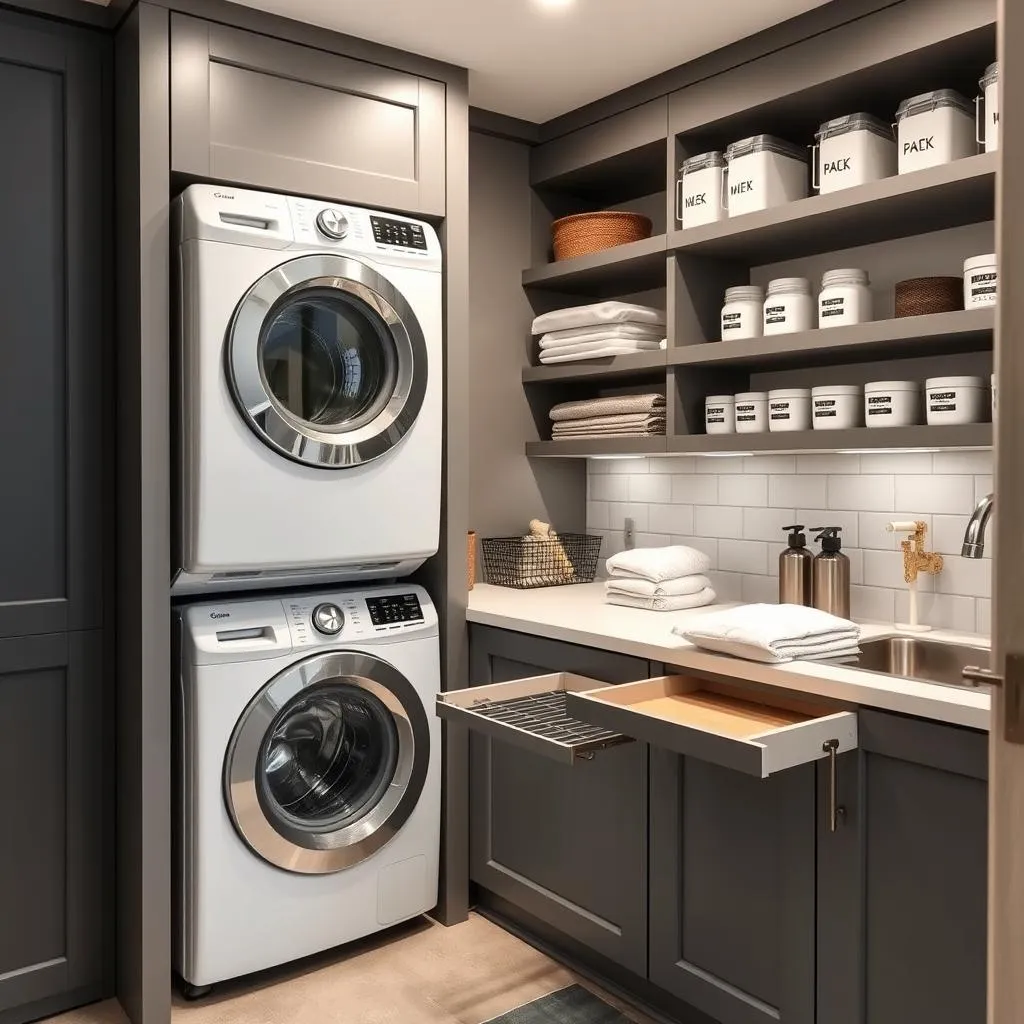 Der Schlüssel zur Ordnung ist ein durchdachtes Aufbewahrungssystem: Hochschränke mit herausziehbaren Wäschekörben in drei Fächern (weiß/bunt/fein) erleichtern das Vorsortieren. Ein ausziehbares Bügelbrett in einem Schrank spart Platz und ist sofort griffbereit. Wandregale über den Geräten nutzen die tote Fläche für Waschmittel und Weichspüler.